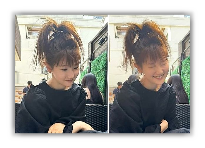 μ΄λΌλŠ” 문ꡬ와 ν•¨κ»˜ μžμ—°μŠ€λŸ¬μš΄ λ―Όλ‚―, μ•ˆκ²½, λ†’κ²Œ 묢은 ν—€μ–΄, λΈ”λž™ μ›ν”ΌμŠ€ λ“±